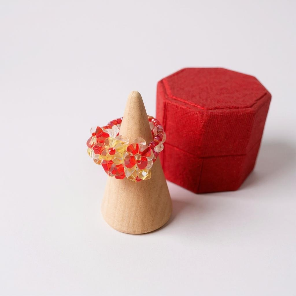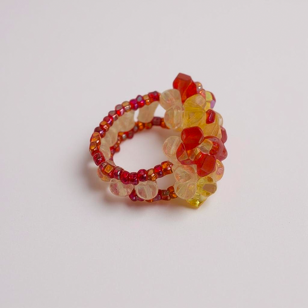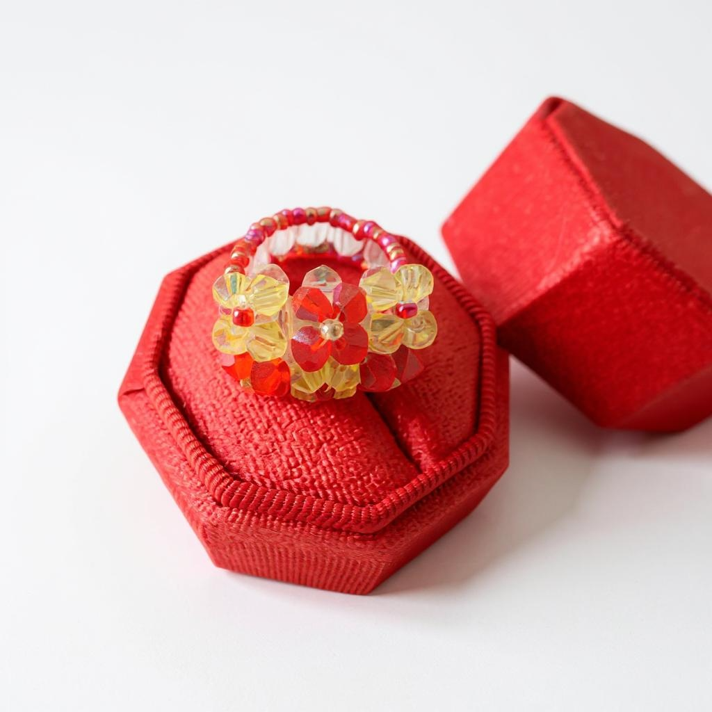 Add a touch of summer to your fingers with the Amber Blossom Ring. Handcrafted with delicate red and yellow beads, this floral statement piece features three blooming flowers set on a double elastic band. Playful, radiant, and one-of-a-kind — perfect for sunny days or bold evenings.