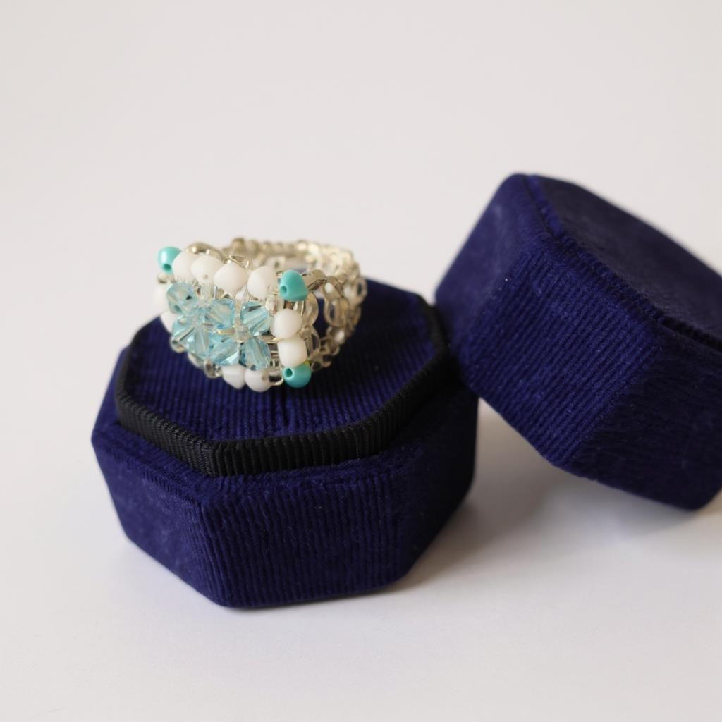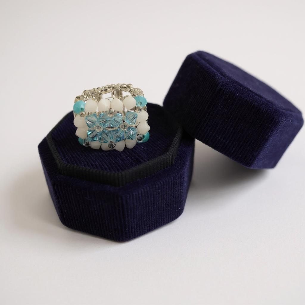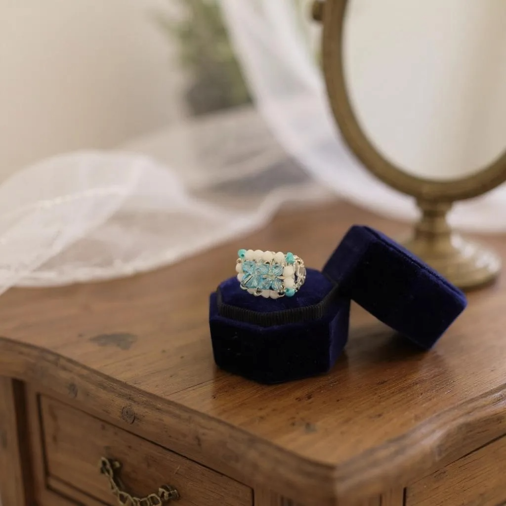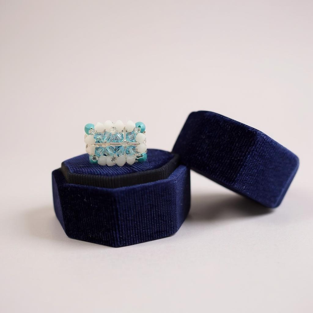 Handwoven with care, it features sky blue facets and soft white beads, forming a floral-like design that whispers elegance.