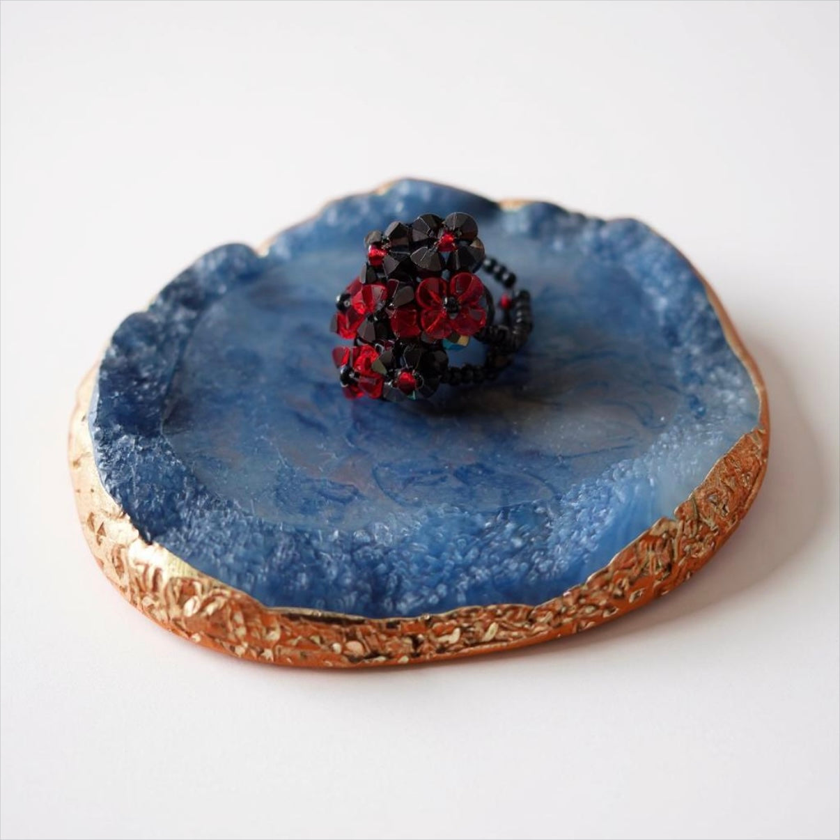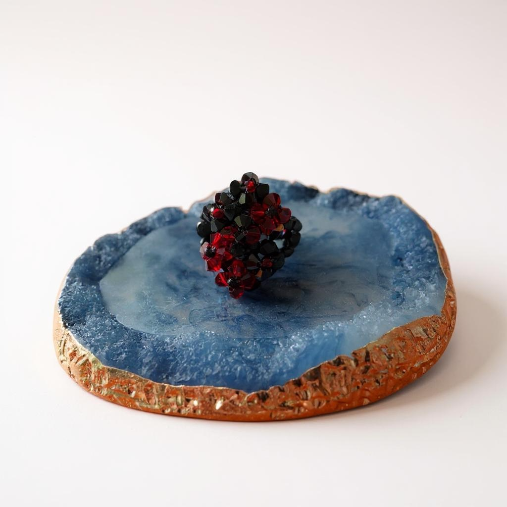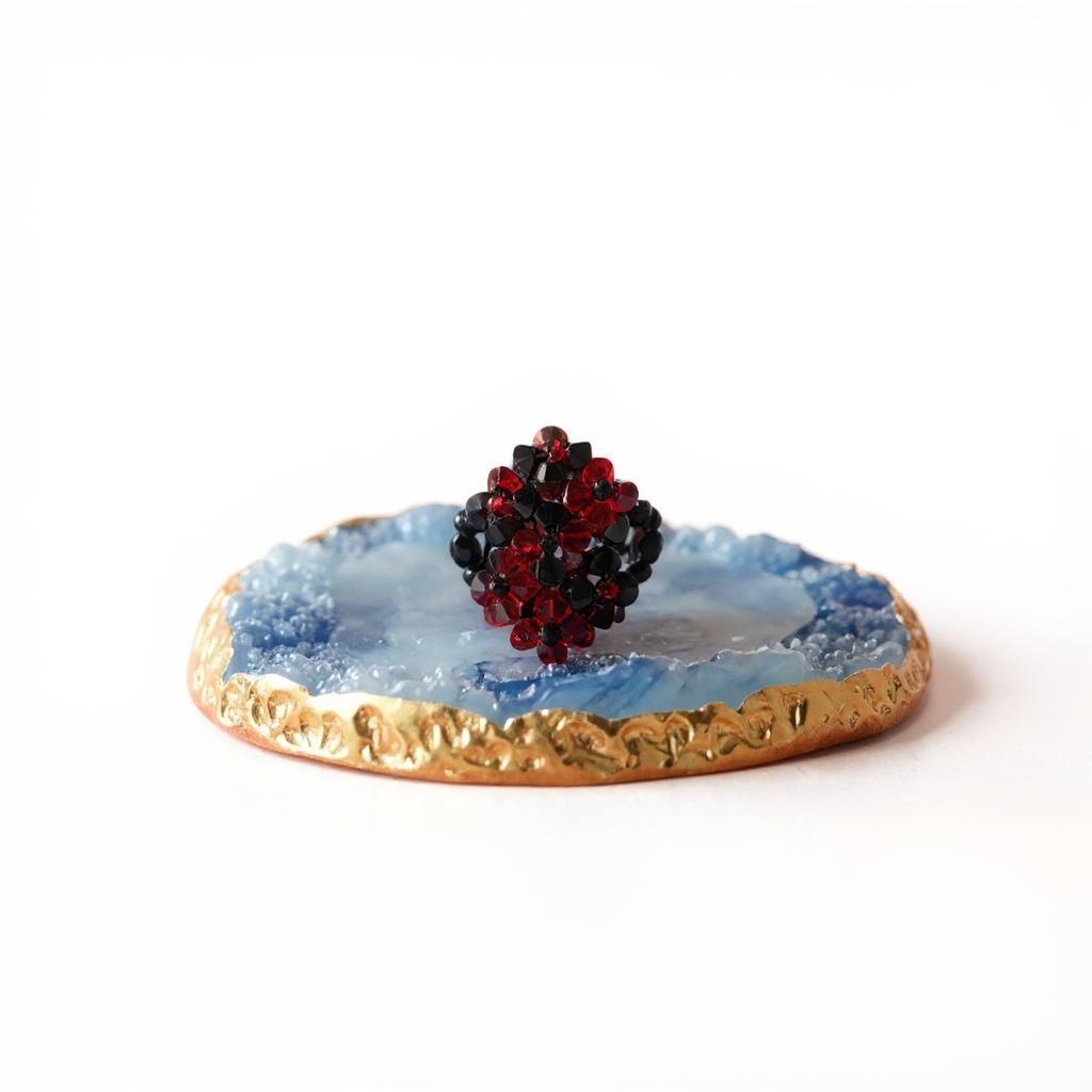 A dark and poetic statement ring, woven with deep garnet red and obsidian black beads. Each petal-like sparkle is a whisper of mystery, perfect for moonlit evenings or bold daytime flair. Handmade with care, it wraps around your finger like a forbidden secret.